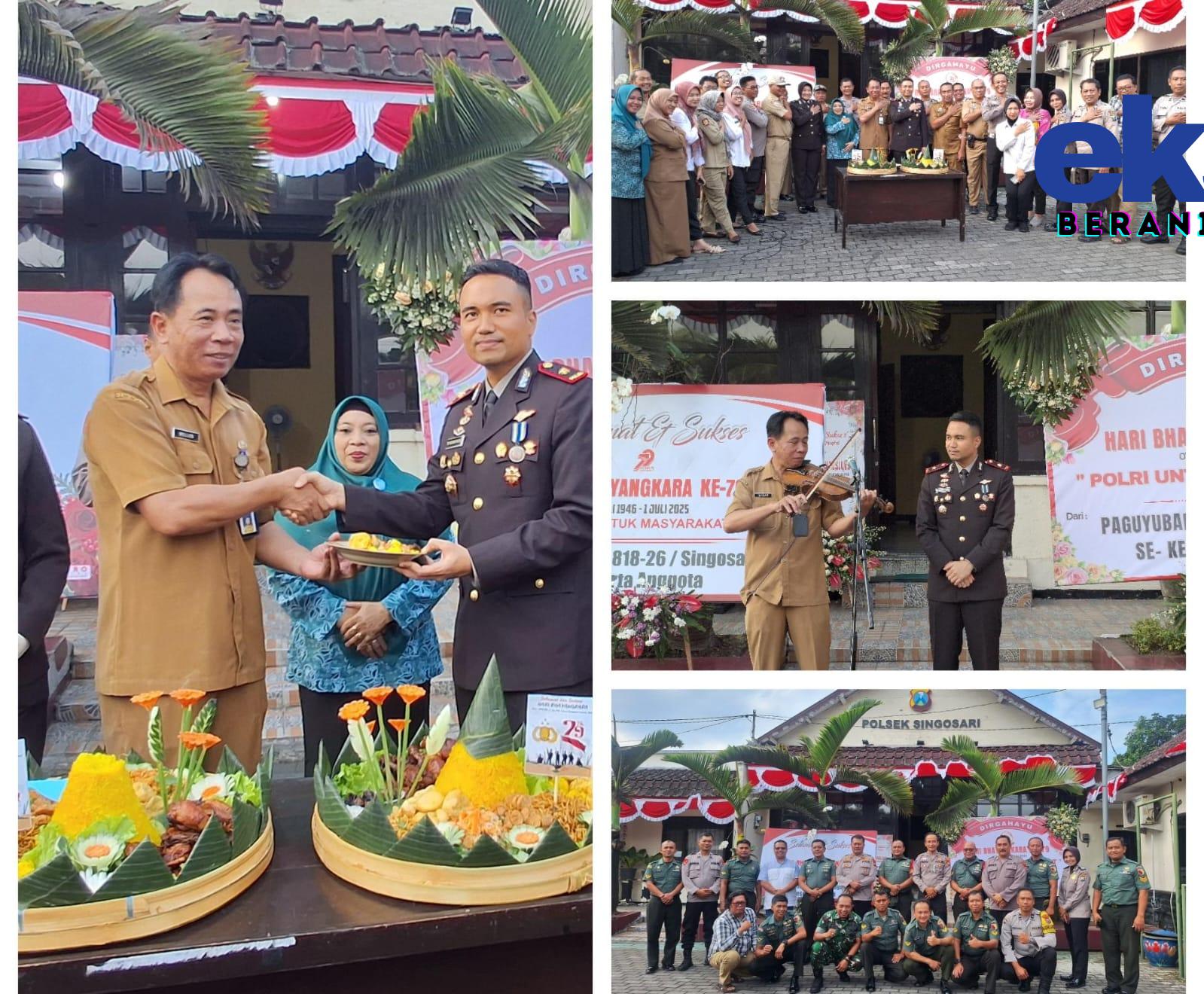 Ekspos.id, Malang — Dalam rangka memperingati Hari Ulang Tahun (HUT) Bhayangkara Ke-79 tahun yang jatuh pada hari Selasa tanggal 1 Juli 2025, Danramil 0818/26 Singosari kapten Arh Heri Widodo (Diwakili Peltu Budi.S) bersama Plt Camat Singosari Wellem S.Sos dan jajaran berikan kejutan/surprise kepada Kapolsek Singosari Kompol Try Widianto, S.I.K., M.Si. Kegiatan tersebut bertempat di Mapolsek Singosari jalan kertanegara kelurahan candirenggo Kecamatan Singosari kabupaten Malang.