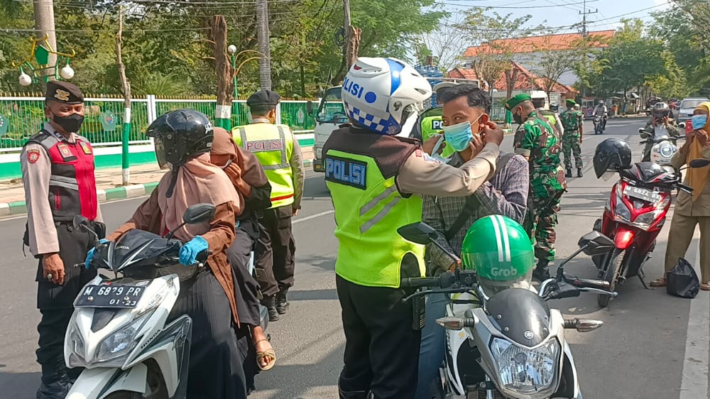 Petugas melakukan patroli dan pengawasan prokes sambil membagikan masker gdatis kepada pengguna jalan dan di beberapa tempat keramaian seperti cafe, pertokoan dan lainnya.